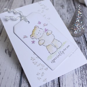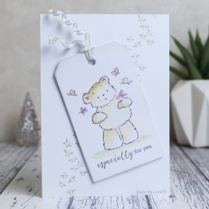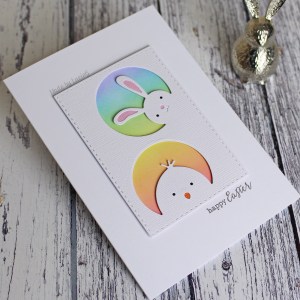 I stamped and coloured the image and then I embossed a frame using a circle die. I then masked around the circle and blended a little grey distress ink. The sentiment is by Penny Black.
