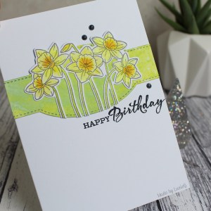 I stamped the image and then coloured it in using my Twinkling H2Os. I then embossed the Clearly Besotted sentiment, cut it out with a Lawn Fawn die and folded the end to reflect the sketch. I rarely play around with my sentiments like that, but I really like the effect, must try it more often!