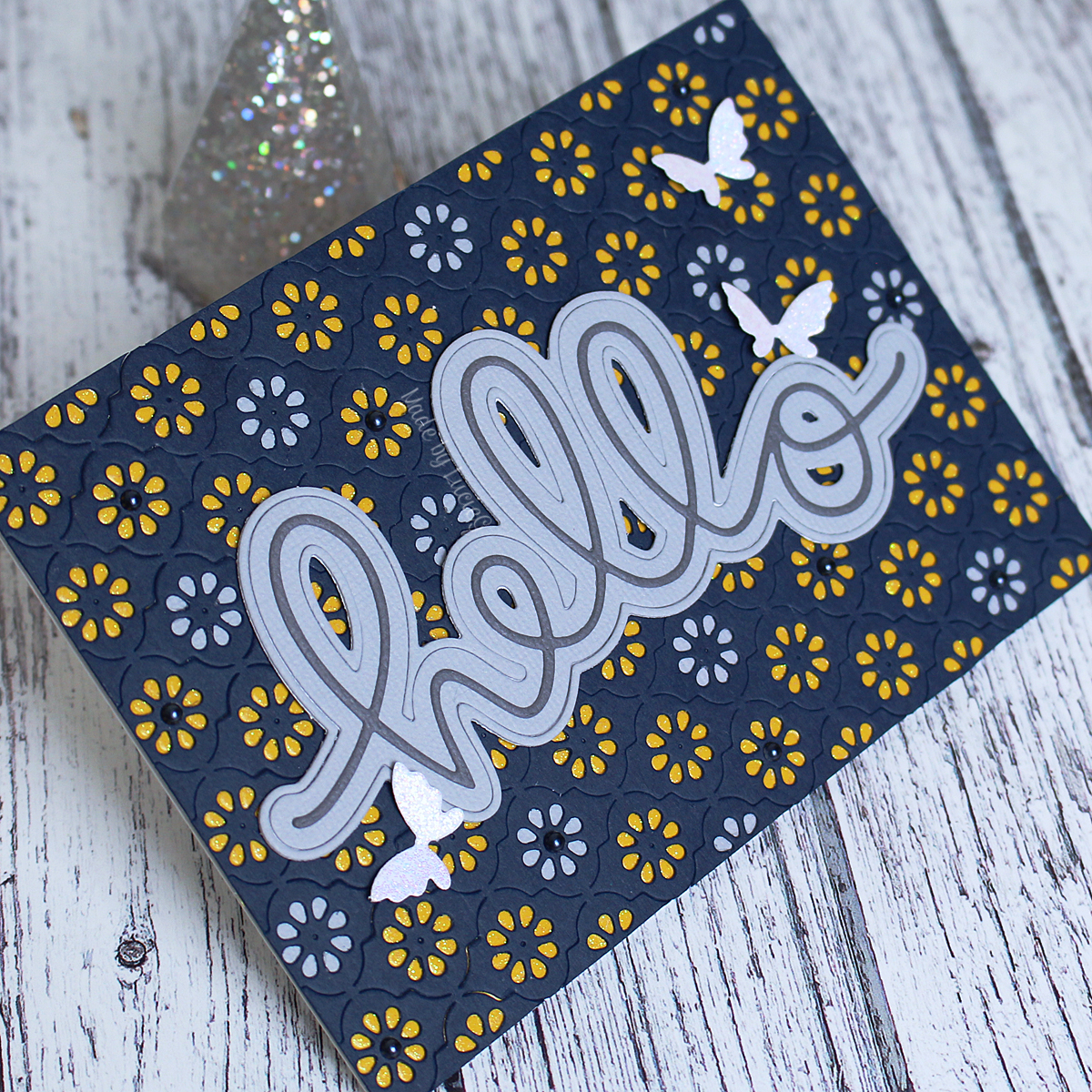 I tried out Jennifer McGuire’s faux inlaid die cutting technique for the mustard petals – but I didn’t think it work properly so I just adhered pieces of grey card rather than embossing them first. Now they are in situ, I think I can see a bit of a difference… can you?