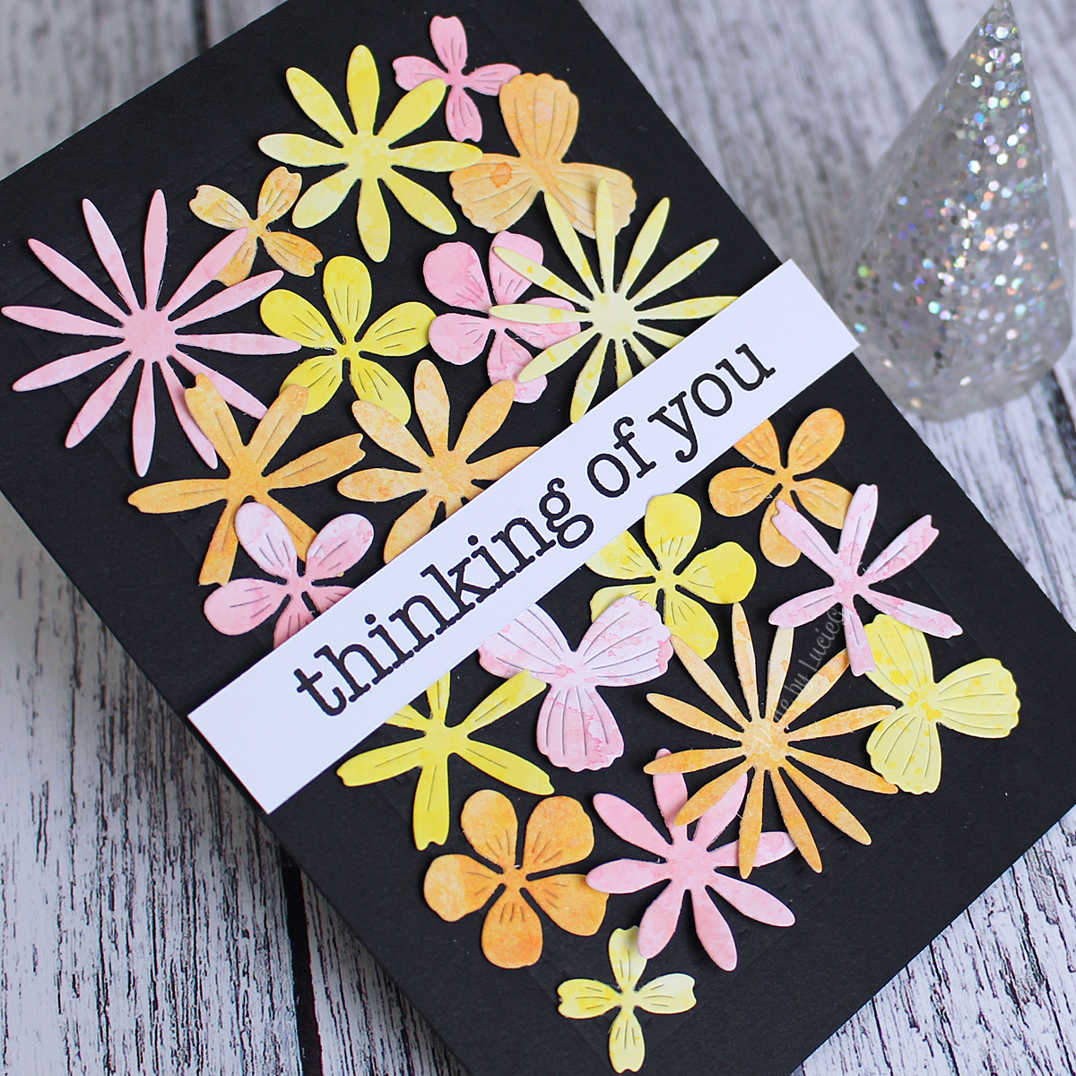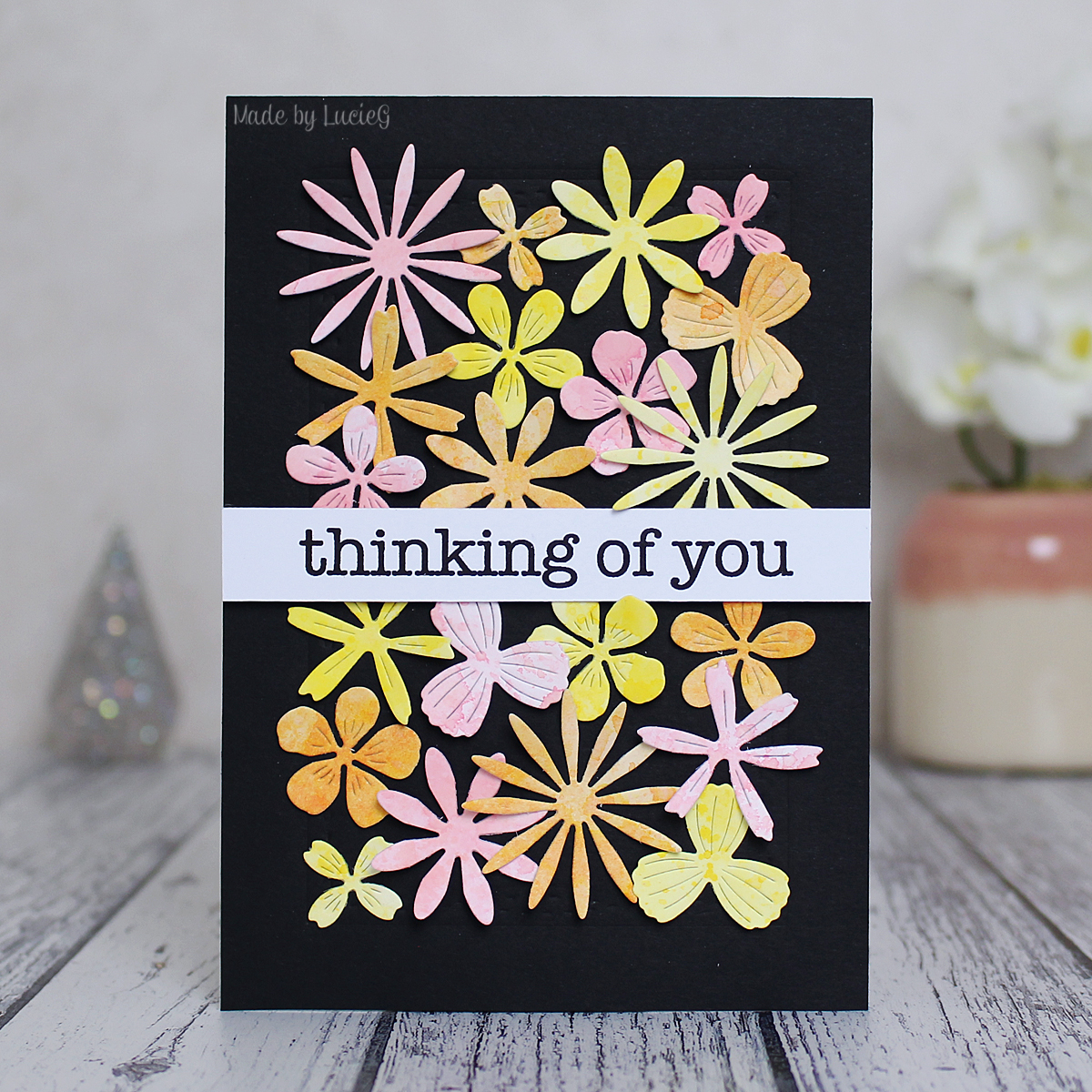 I embossed a black panel using a frame die (although it’s a bit difficult to see in the photos) and then arranged all my flowers within that frame. When I was finally happy with the arrangement, I stuck them all down and added a very old Hero Arts sentiment to complete my card.