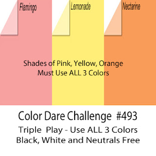 Today I’m playing along with a new-to-me challenge called Color My Heart Color Dare. I was originally going to use this card as my entry but when I read the rules, I realised that the tiny bit of green on the flower stems wouldn’t work – but that’s OK, it was a joy to use this cheerful combo to make another card!