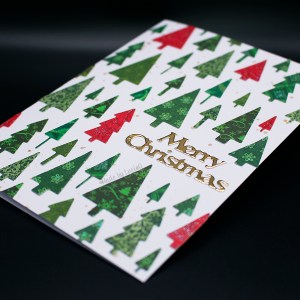 I used a couple of shades of green ink to create backgrounds that I then die cut. I partially cut a couple of card bases to create a shaped card base and adhered the die cut trees on top, hiding the section of the folded card that was not die cut.