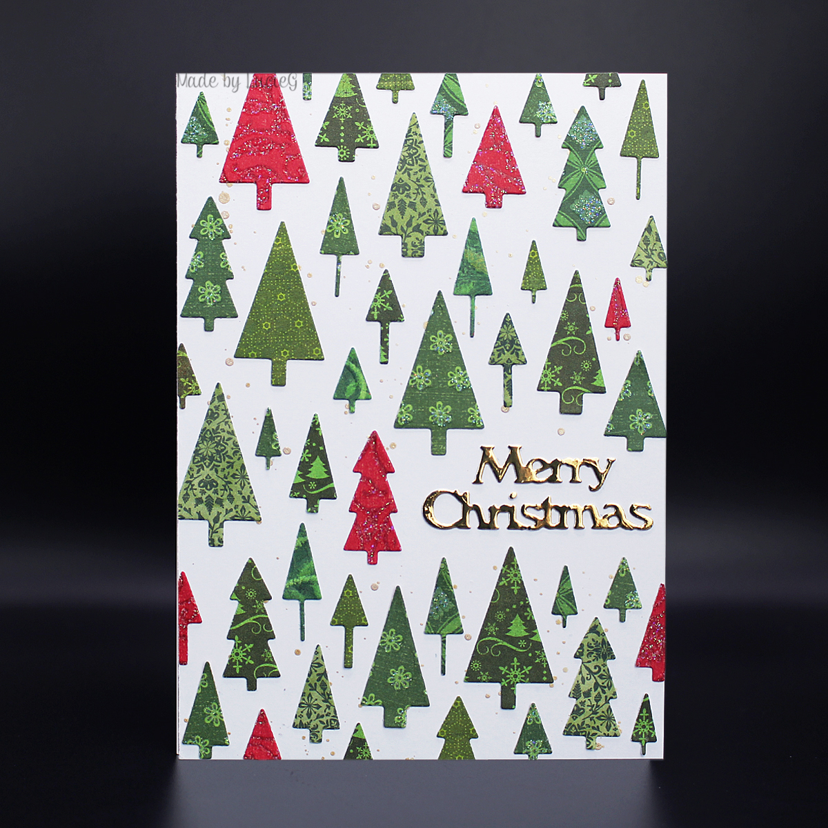 I used a couple of shades of green ink to create backgrounds that I then die cut. I partially cut a couple of card bases to create a shaped card base and adhered the die cut trees on top, hiding the section of the folded card that was not die cut.