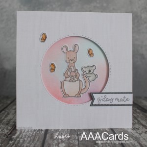 I like the sentiments on the set, but really wanted one that said ‘G’day mate’ – so I used wording from two of the stamps and some post-it notes as I couldn’t bring myself to cut up the sentiment stamps!!