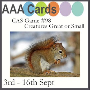 My teammates have shared some gorgeous CAS cards on the AAA Cards blog and we are also joined by Guest Designer Marge from margecrafts. I’m sure many of you already know Marge – one of the sweetest crafters I have met online! This challenge is perfect for her as she creates the most beautiful critter cards – please drop by her site to see them and many more!