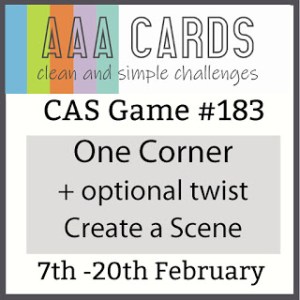 It’s time for another challenge at AAA Cards! This fortnight we’d like you to create a CAS card using one corner of your card base only. Our optional twist for this challenge is ‘create a scene’!
