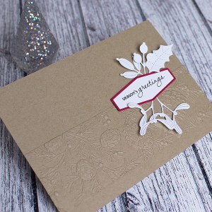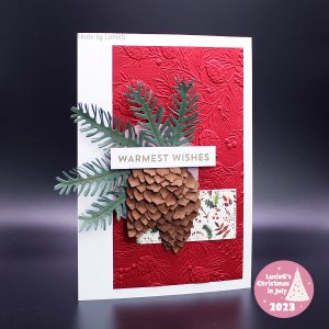 The background is embossed with my beloved Pinecone Plethora folder and the main image is an oldie but goodie – the Antique Pine Label die by Memory Box. After colouring it with distress inks, I added a Simply Graphic berry die and a few cones from the Stampin’ Up Christmas Pinecone die set that I first used for this card.