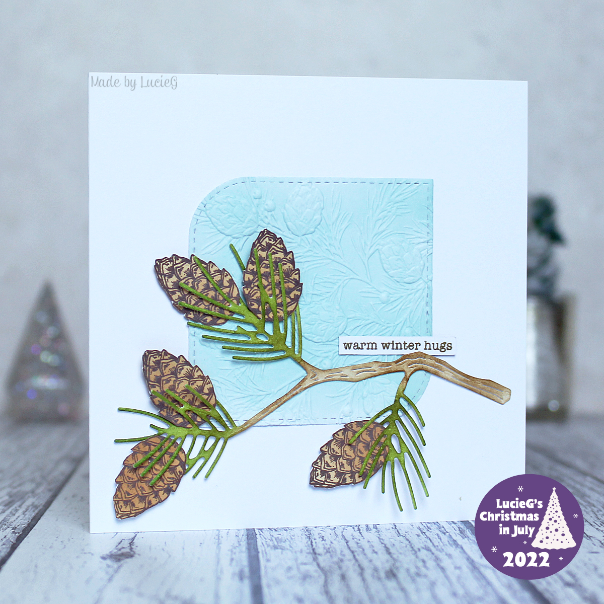 The background is embossed with my beloved Pinecone Plethora folder and the main image is an oldie but goodie – the Antique Pine Label die by Memory Box. After colouring it with distress inks, I added a Simply Graphic berry die and a few cones from the Stampin’ Up Christmas Pinecone die set that I first used for this card.