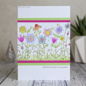I used one of my favourite Hero Arts wood mounted stamps – the Nice Little Flower Border from 2005. I remember using this stamp a LOT back in the day. It’s not as long as the width of my card, so I simply stamped it in the centre and then once either side. I never used to do that! I think I was nervous about lining up the image, but after using rubber stamps a lot again this year, I’m much more confident when I stamp with my wood stamps and Hero Arts stamp very well, so it was actually pretty easy to line up the image!.