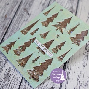 Anyway, the good thing about ‘fast craft’ is that I haven’t seen this ‘in the wild’ for some time and I have lots of ideas for it now! First up was quite a labour of love – a shaker card! Yep, each of the trees (and the three stars) is a mini shaker! I die cut a layer of fun foam and adhered that to my patterned paper base, filled it with little beads and sequins before adding the acetate and a layer of die cut paper on top.