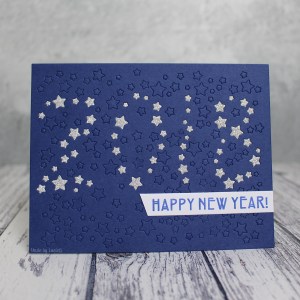 For today’s card, I used the fabulous Hero Arts star confetti die. I knew that I wanted to create the ‘2018’ from the stars using the inlaid die cutting technique but I didn’t want to spend ages fiddling with die cut stars. So, I embossed the die onto some white card and coloured stars in pencil, erasing multiple times until I had a pattern that I was happy with. Then I ran the die once through my Big Shot – this was enough to cut the stars and still leave most of them in situ when I removed the card from the die. I stuck it lightly to a card base using Kokuyo tape which I knew would give me the flexibility to remove some of the blue stars and replace them with silver ones.