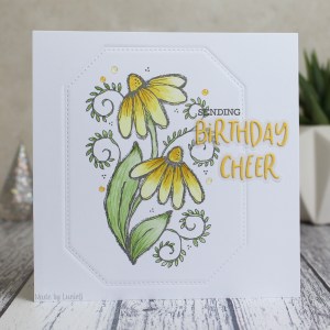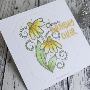 I coloured it with my Twinkling H2Os using the palette from this week’s CAS Colours & Sketches challenge (saffron, yellow and green). I didn’t want too many layers on my card so I embossed a My Favorite Things frame die around the image and adhered a die cut sentiment from Honey Bee (as well as stamping ‘sending’ from a Clearly Besotted set). Finally, I added a few Nuvo Jewel dots to finish off my card.