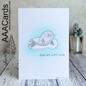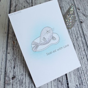 But of course, I can’t resist the odd cutesy purchase here and there! For today’s card, I pulled out the sweet Seymore Seal stamp by Impression Obsession. He’s a November purchase and I’m so pleased that I was able to use him for this challenge! After stamping him, I masked the image and then stamped an ice block from a My Favorite Things set. I masked that block and sponged a light layer of Distress Ink across the background. After I removed the masks I coloured the ice and Seymore using my Twinkling H2Os. The sentiment is also by My Favorite Things.