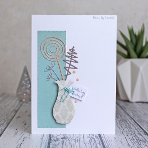 I applied a layer of gold Cosmic Shimmer Luna paste to a kraft base. Whilst it was drying, I cut the branch (Bright Rosa) and added a few white Nuvo drops to some berries. To complete my take, I added a Clearly Besotted sentiment.