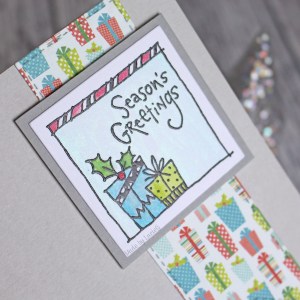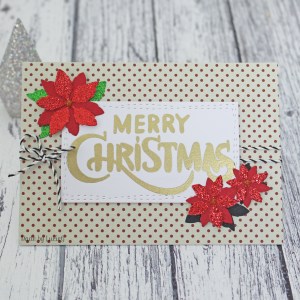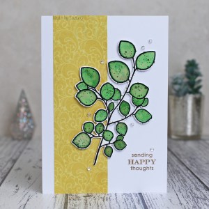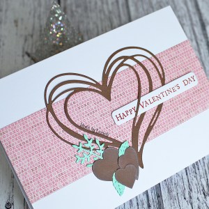I used some of my My Mind’s Eye patterned paper mountain for the centre strip and adhered a heart die from Impression Obsession. I was really drawn to the green pops of colour in the Time Out inspiration photo and so I incorporated that into my card by cutting some foliage and it adhering it behind some very old Simon Says Stamp/Kelly Purkey die cut hearts. Finally I added a sentiment by Hero Arts. They’ve actually just released a clear set with this sentiment/font but I went old school and dug out my wood mounted stamp!