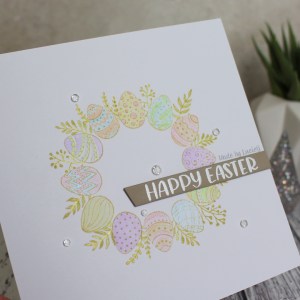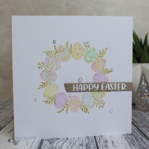 Today, I’m sharing one more Easter card – this is the one I made for my mum using a sweet Nellie Snellen wreath stamp and a sentiment from Simon Says Stamp. I coloured it with my Twinkling H2Os and then added a few Studio Katia gems to finish it off!
