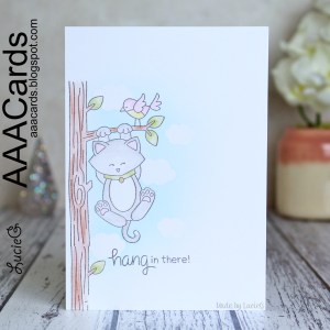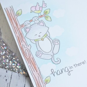 When I saw the optional twist, I knew I had to use the fabulous ‘Newton hangs out’ set from Newton’s Nook which has a couple of super encouragement sentiments. I wanted to create a little more height with the main image so I stamped a section of the tree trunk twice. I coloured the image with my Twinkling H2Os and then masked it off. I added a few clouds cut from masking paper and then gently applied some Tumbled Glass distress ink. I love removing the mask from an image, don’t you? Almost as satisfying as heat embossing!