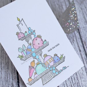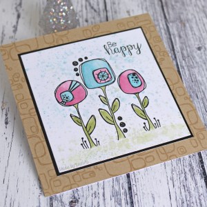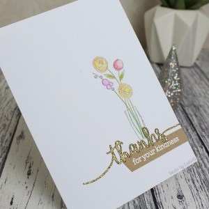 I stamped a PaperArtsy image and coloured it using my Twinkling H2O paints. I splattered some paint lightly around the image and then added the stamped sentiment together with the die cut ‘thanks’. To finish off the card, I added some extra shimmer to the flowers using my Nuvo Aqua Shimmer glitter gloss aquabrush.