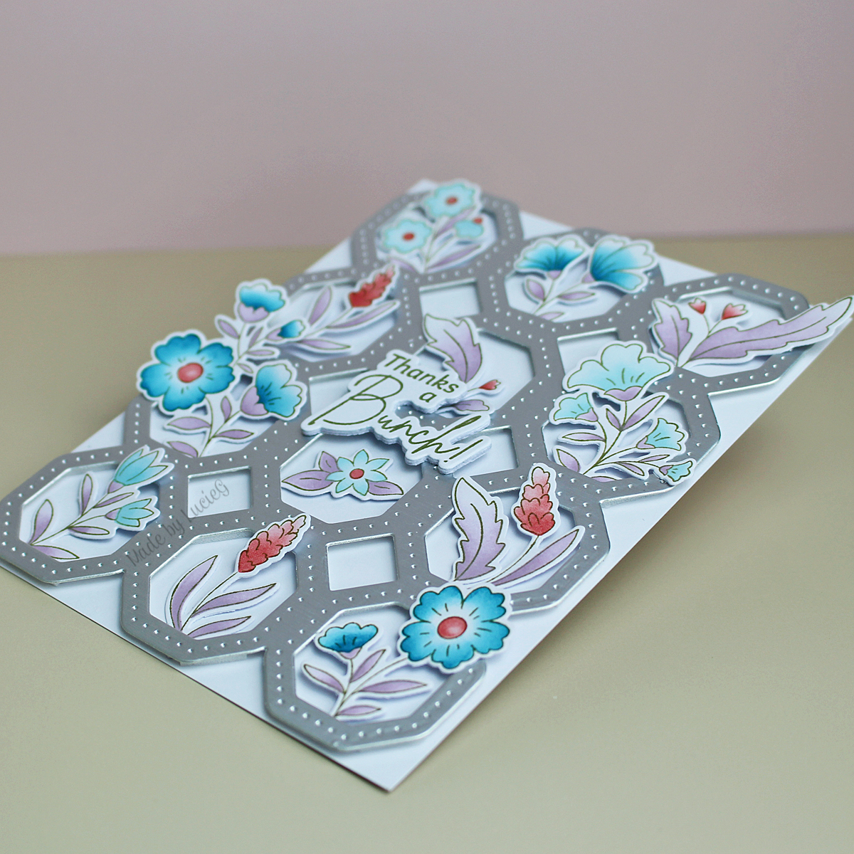 I also used my Octagon Grid Coverplate die again – this time to cut some satin silver card. It was VERY difficult trying to decide which images to omit from the card – I will have to use them on another card I think!