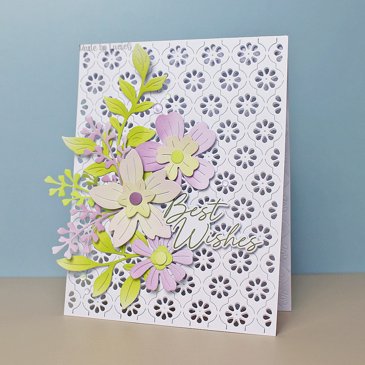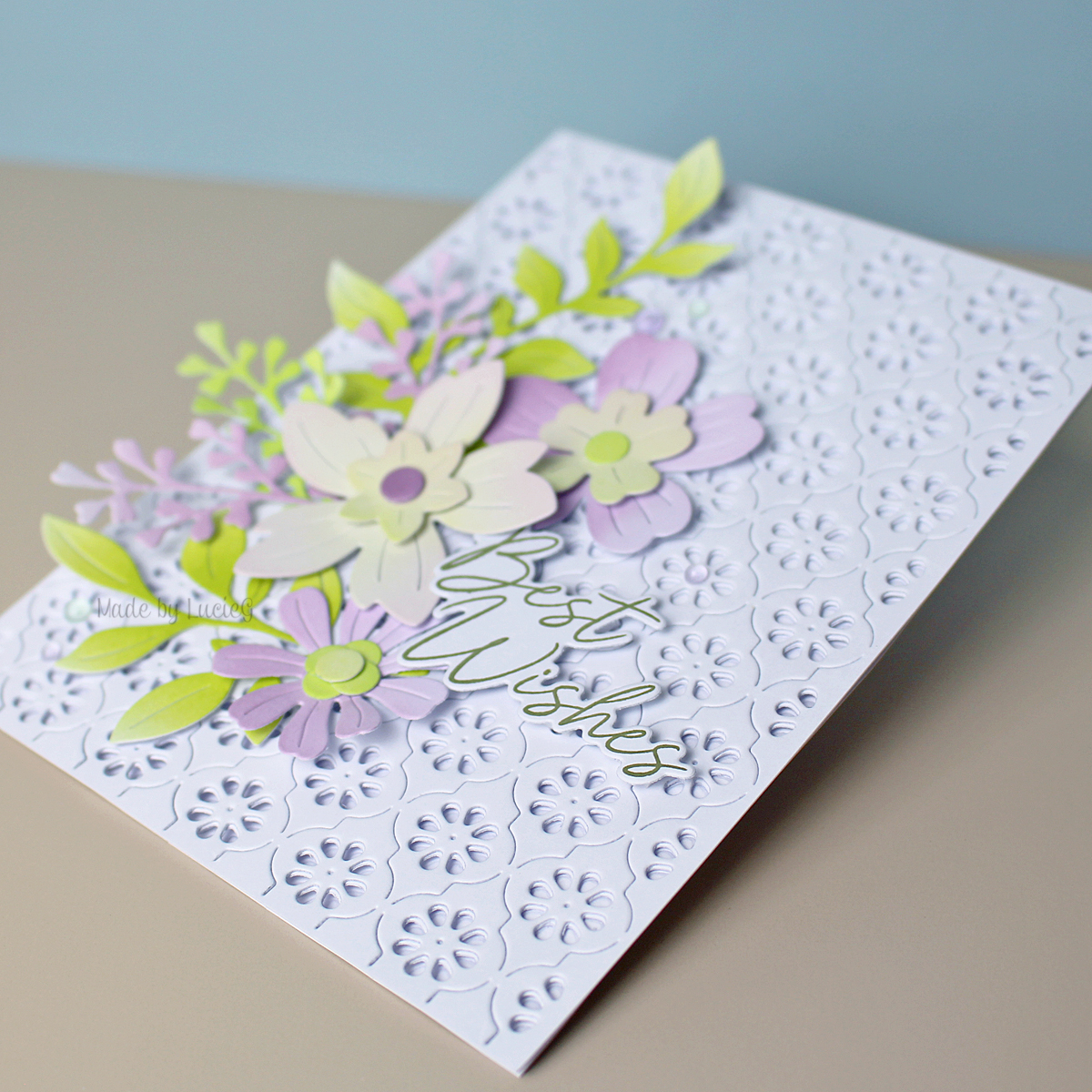I just received the beautiful Bloomscape product suite from the latest release on Friday and couldn’t wait to ink it up! A few years ago I received a The Colour Schemes Bible which I’ve been turning to more often recently. The colour palette I selected didn’t include any green and I was going to include it as an extra ink for the foliage but then I thought – why not use purple? After all I love the blue/teal leaves that DT members frequently use, why not try something different? I’m rather pleased with how it turned out as I think the palette works so nicely together and I would’ve used the purple instead of the lighter blue had I added a green to the palette.