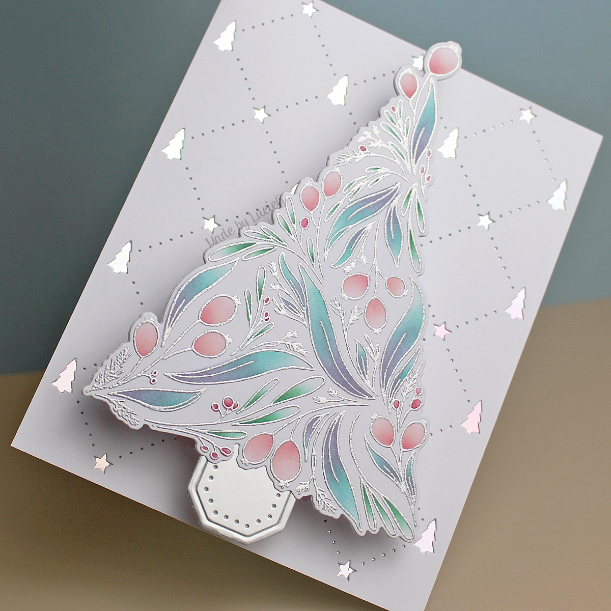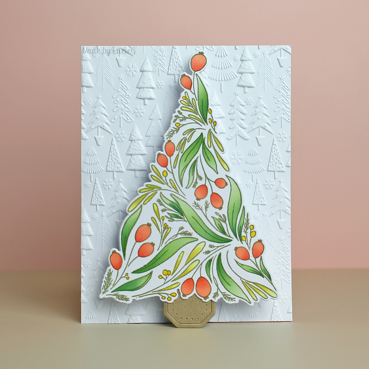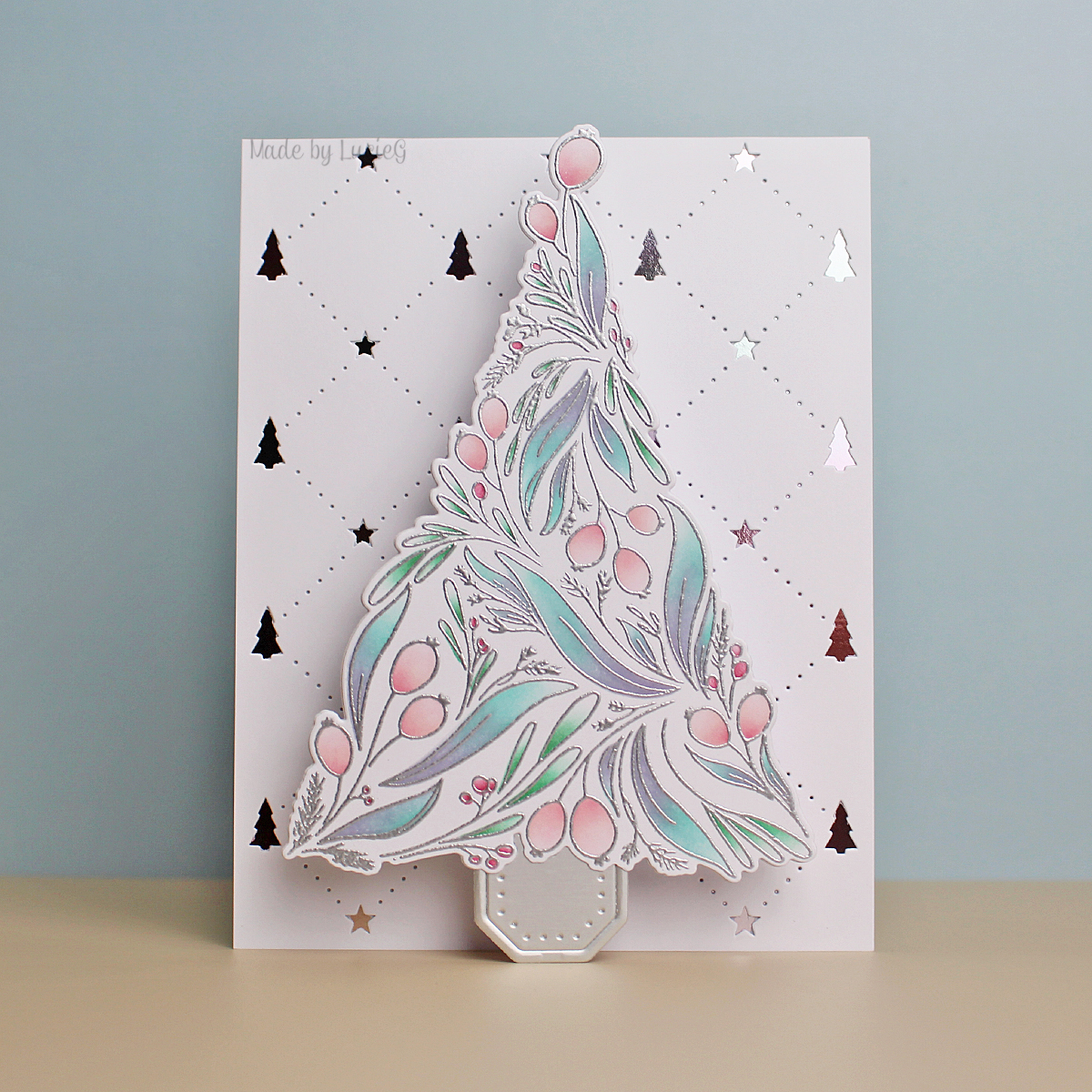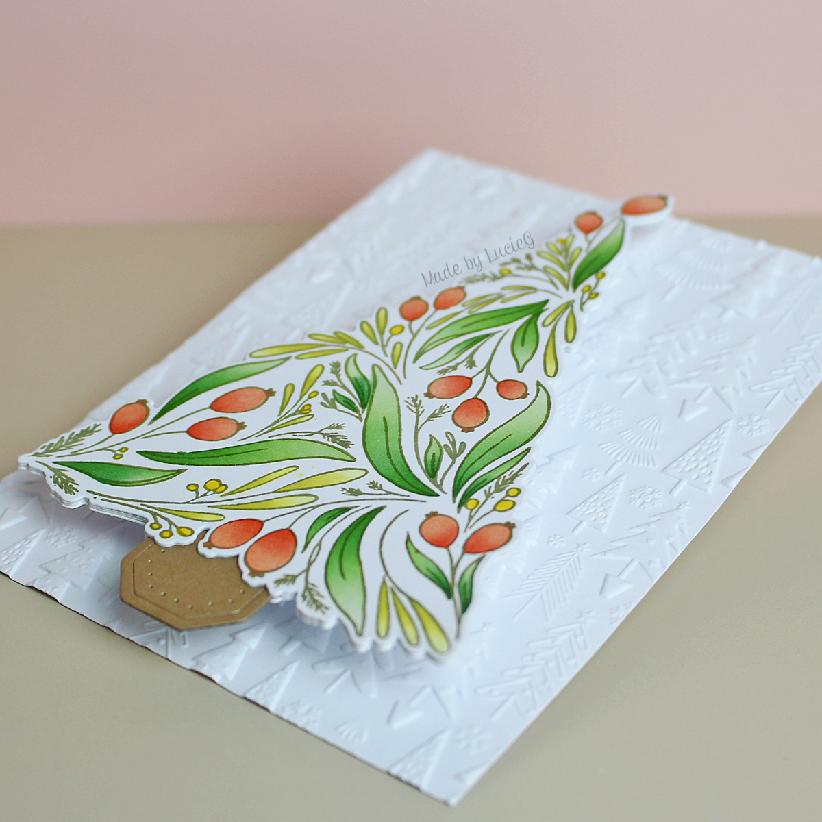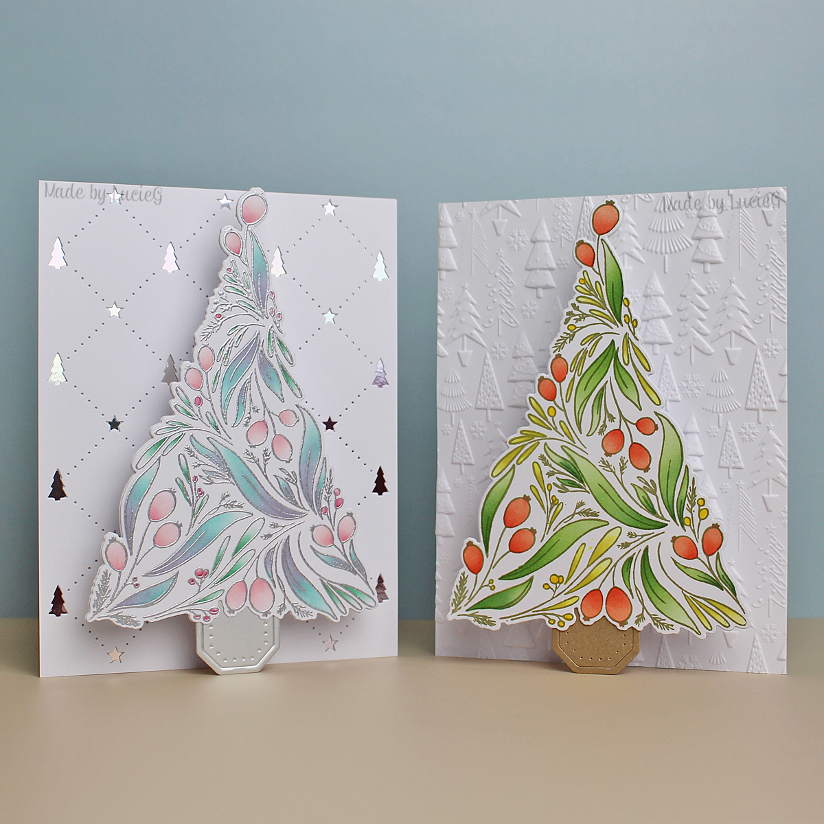 This time, I used the Holiday Diamond Coverplate for my background – I popped the trees and stars out and adhered the panel to some multicoloured mirror card. I coloured my embossed Festive Foliage Tree image with the challenge colours and added Evergreen into the mix. Once again the entire card is supported by an octagon from the Octagon Grid Coverplate die, although I made a larger folded card support for this tree, making it much more stable.