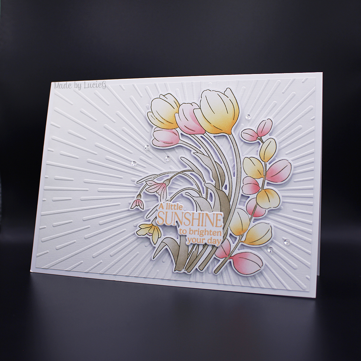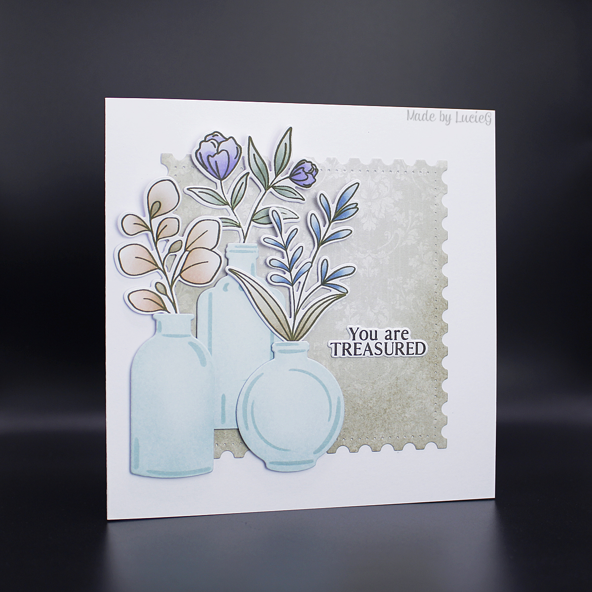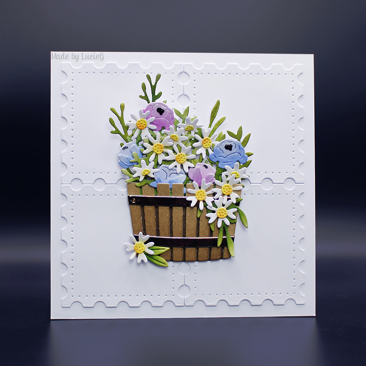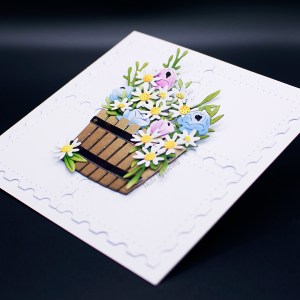 For my card, I used the gorgeous Into The Blooms – Above Ground die set by Papertrey Ink. This beautiful set was just released last month, and I just had to buy it from the US as I haven’t found a UK retailer for Papertrey. I love that basket and all the little elements… although I think some of those tiny dies may end up on the AWOL list before too long! I coloured the images with various inks and then arranged them on a card base that I had covered with four squares from the Dotted Postage Squares die set by Pinkfresh Studio.