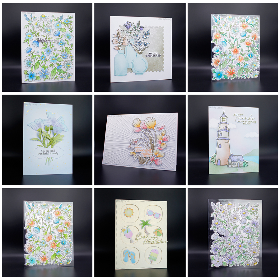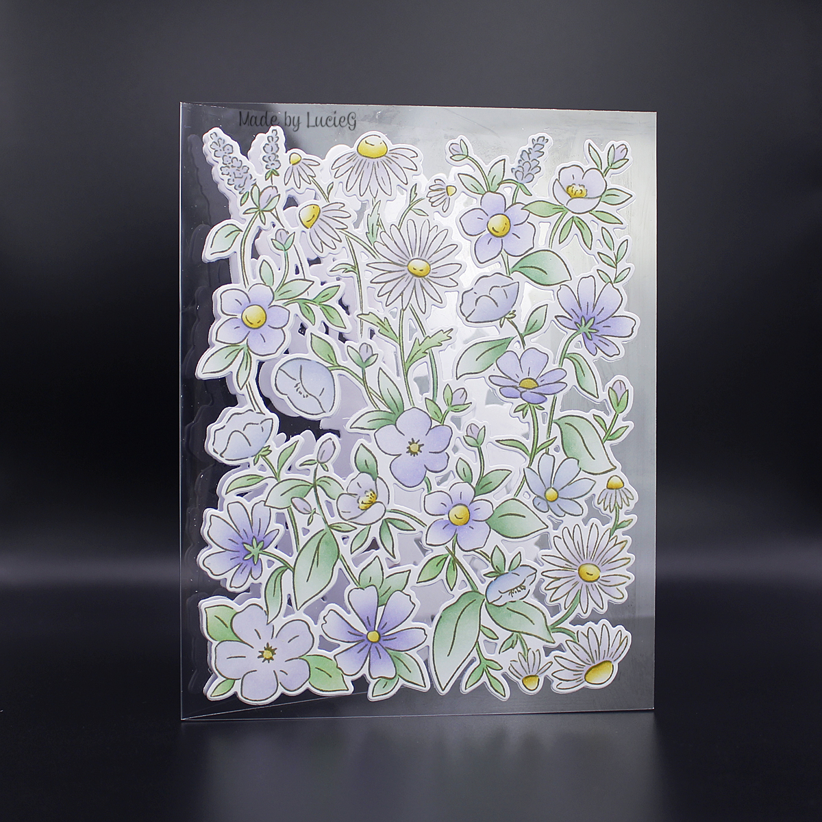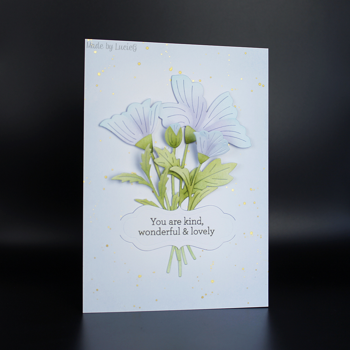 For my card, I used the gorgeous Into The Blooms – Above Ground die set by Papertrey Ink. This beautiful set was just released last month, and I just had to buy it from the US as I haven’t found a UK retailer for Papertrey. I love that basket and all the little elements… although I think some of those tiny dies may end up on the AWOL list before too long! I coloured the images with various inks and then arranged them on a card base that I had covered with four squares from the Dotted Postage Squares die set by Pinkfresh Studio.