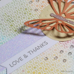 I coloured the wreath with my Twinkling H2Os and then cut it with the coordinating die. I created a watermark-effect background by stamping some of the single images from the set onto my card base in Versamark ink.