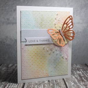 I coloured the wreath with my Twinkling H2Os and then cut it with the coordinating die. I created a watermark-effect background by stamping some of the single images from the set onto my card base in Versamark ink.