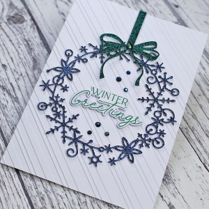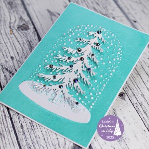 I adhered the tree to a background that I had embossed with Simon’s Sprinkle Snowglobe folder. Then came the nerve wracking part – stamping the sentiment! I deliberately chose a small one so that I didn’t need to curve it to align with the snowglobe base, which I always find difficult.