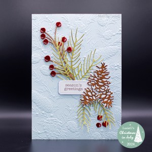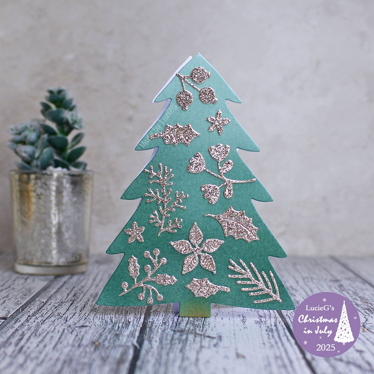 For the ornament tree, I used dies by Concorde & 9th and Memory Box. The glittery foliage card uses dies by Crealies, Spellbinders and Simply Graphic.