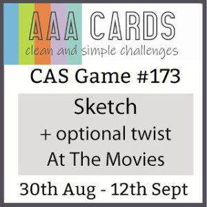 It’s time for the a new challenge at AAA Cards! This fortnight we’d like you to create a CAS card using the sketch we’ve provided; our optional twist is ‘at the movies’! Our sponsor is Casual Fridays .