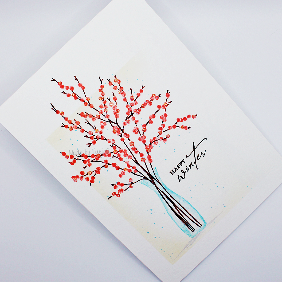 Anyway, for today’s CAS winter card, I used products kindly sent to me by Penny Black. I pulled out the beautiful Berry Bouquet brushstroke cling stamp (40-860) and some Arteza markers and distress inks. I was originally going to colour the berries different shades of red, but I liked my base colour (Saltwater Taffy) and abandoned the other colours! I did add some Stickles to random berries though!