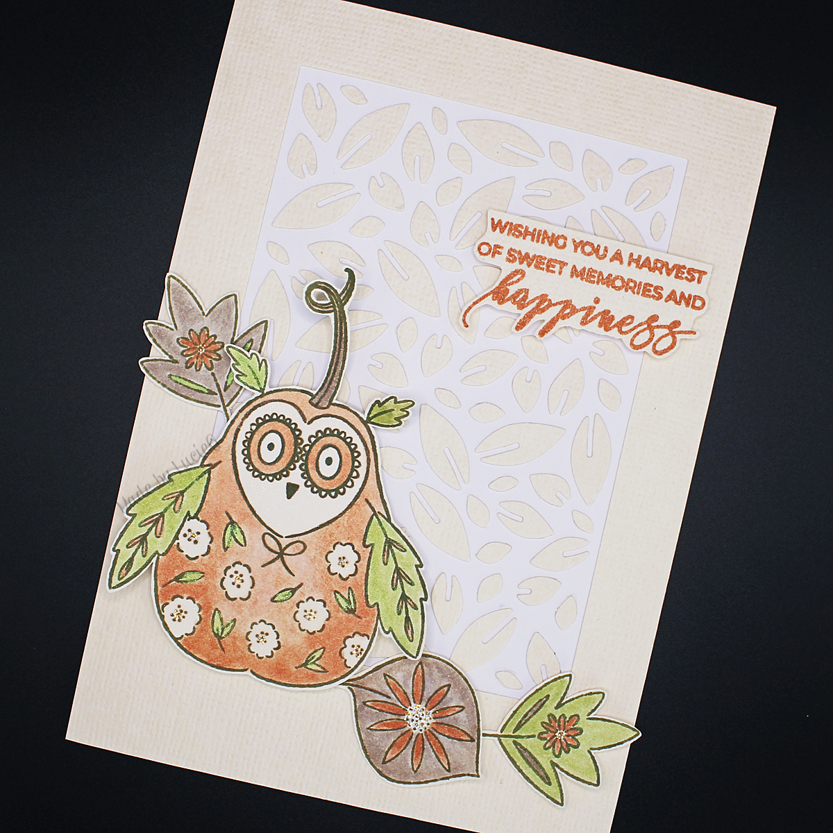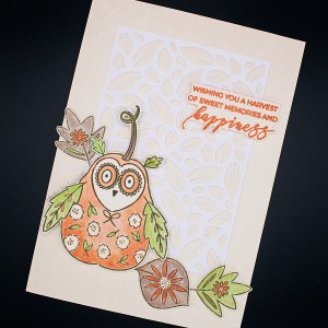 I have to say the background was a labour of love! I cut the Leaf Pattern die (51-432) from a panel of cream cardstock. I put the main image to one side (you may see that later this autumn!) and adhered the frame and 3,000 tiny leaves to the card base. I used the die cut image as a guide to position all the leaves and then worked in sections, picking up gluing down about 8 at a time. It didn’t take too long really!