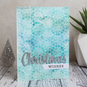 Anyway, I embossed a Deco sentiment from Woodware and then assembled my card. Think this one took me longer to photograph than create! It’s so difficult to capture that pixie Powder shimmer!