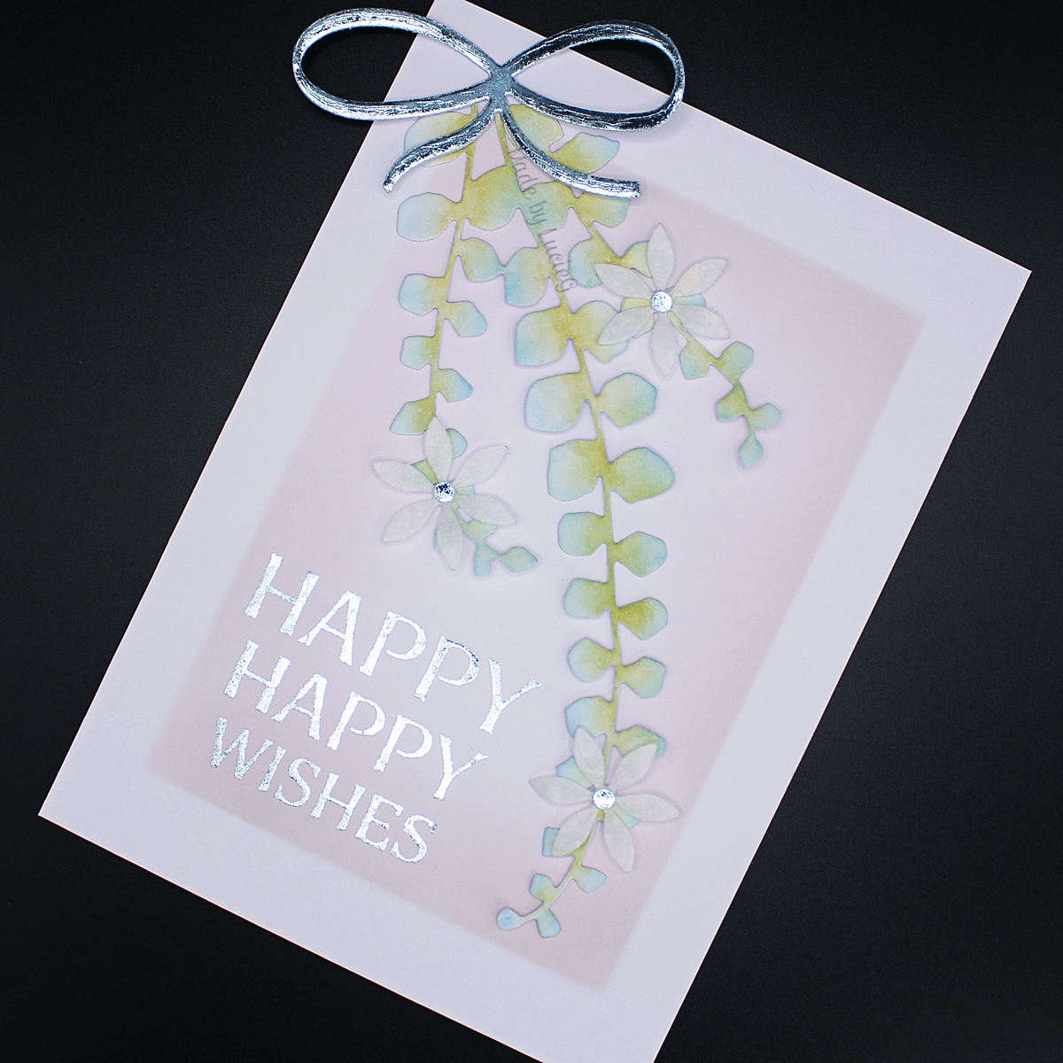 My first card showcases the stunning Ascending die (51-820) which is probably my favourite Penny Black foliage die! I used a stencil from the Background Basics set (25-021) and blended some distress ink on my card base. I coloured the Ascending die cut with distress inks and arranged it on my card, leaving room for a foiled sentiment from the new Shining Wishes Stick & Shine Sheet (15-017) which I covered with foil from the new Blooming foils set (21-003). I also applied some foil to a small piece of card for the bow from the Jumbo Bauble die set (51-743) and centres for my vellum flowers, which are cut with dies from a new-to-me set, Flourish (51-421).