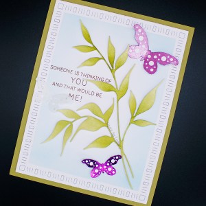 I then turned my attention to the elegant Dignified die (51-821) which I coloured with distress inks. The background panel was cut using the largest die from the Dainty Dashes Stackers die set (51-636) which I adhered to a green card base. After masking off the frame, I blended a little distress ink over the centre of my white panel. I applied two butterflies from the from the new Shining Wings Stick & Shine Sheet (15-015) to a piece of card, added foil from the new Blooming foils set (21-003), fussy cut and adhered them to my card. I was so excited to see more of these beautiful butterflies as I use the ‘original’ die ALL the time – it’s from the classic Flourish and Butterflies set (51-198), and of course a die cut makes an appearance here – cut from vellum! The sentiment is from the new Brighten the World stamp set (31-056).