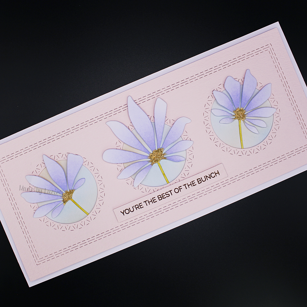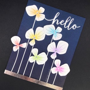 As soon as I saw the release, I was drawn to the pretty Flower Family die set (51-819). I am CONVINCED that this mirrors a wood-mounted stamp but I can’t find it in my (rather extensive) wood-mounted stamp collection or online! Anyway, this super simple card came together really quickly! I coloured the centres with different distress inks and added some gems. I blended some Black Soot and Chipped Sapphire distress ink across the bottom of a navy card panel and adhered the flowers. I then chose a sentiment from the new Shining Wishes Stick & Shine Sheet (15-017) which I covered with foil from the Metallics foils set (21-001). To complete my card, I added a thin strip of silver card to anchor my flower family. Click here to see another card that I made with this die set.