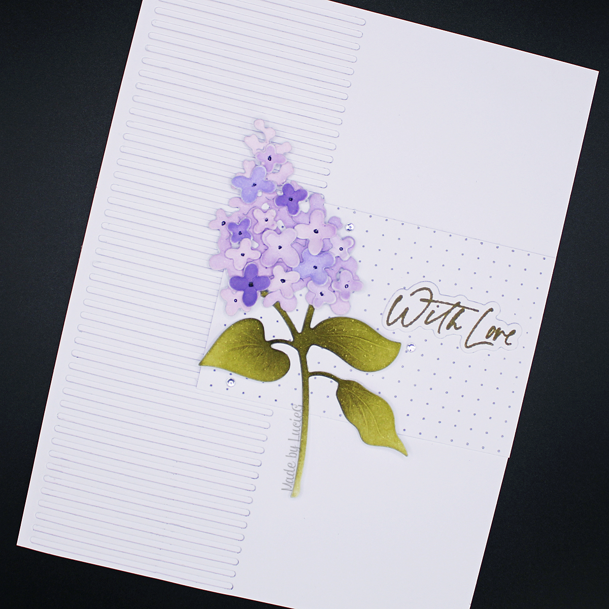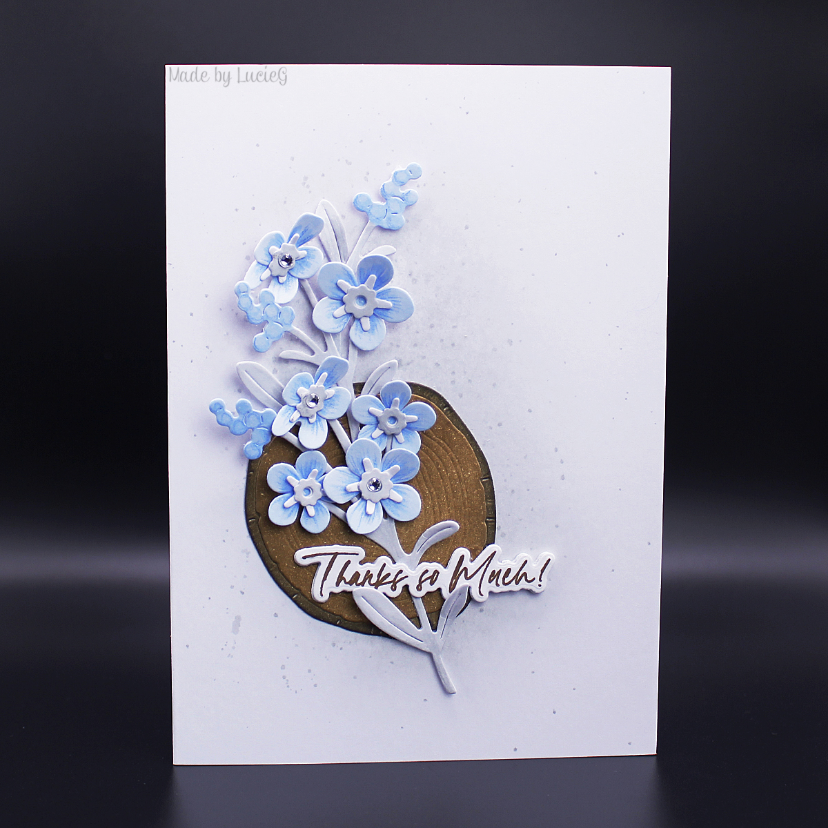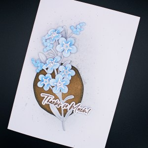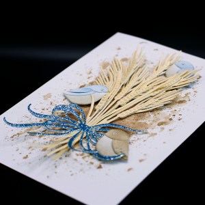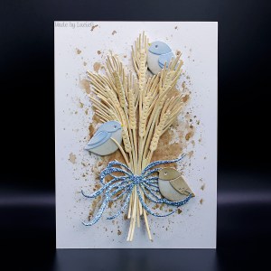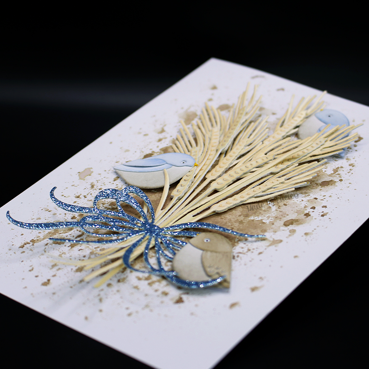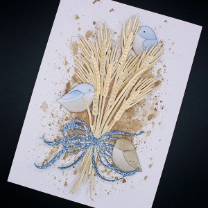 Instead, I pulled out The Greetery’s Wheat botanicuts set and cut it from white regular card and cream pearlescent card. I coloured the white card with Antique Linen distress oxide ink and I dusted the pearlescent card with the same ink for extra depth of colour. I mixed the two types of card when assembling the heads of the wheat stems.