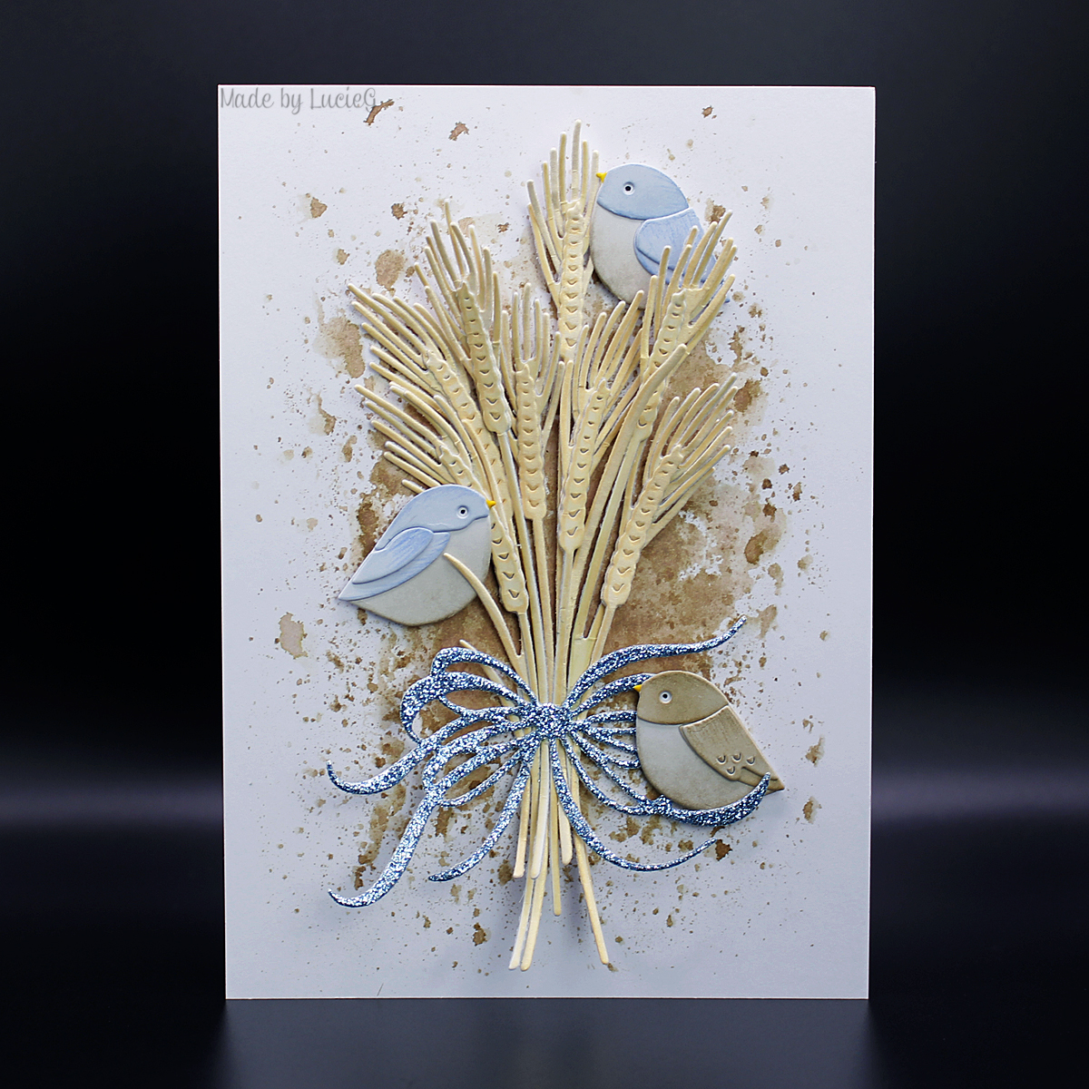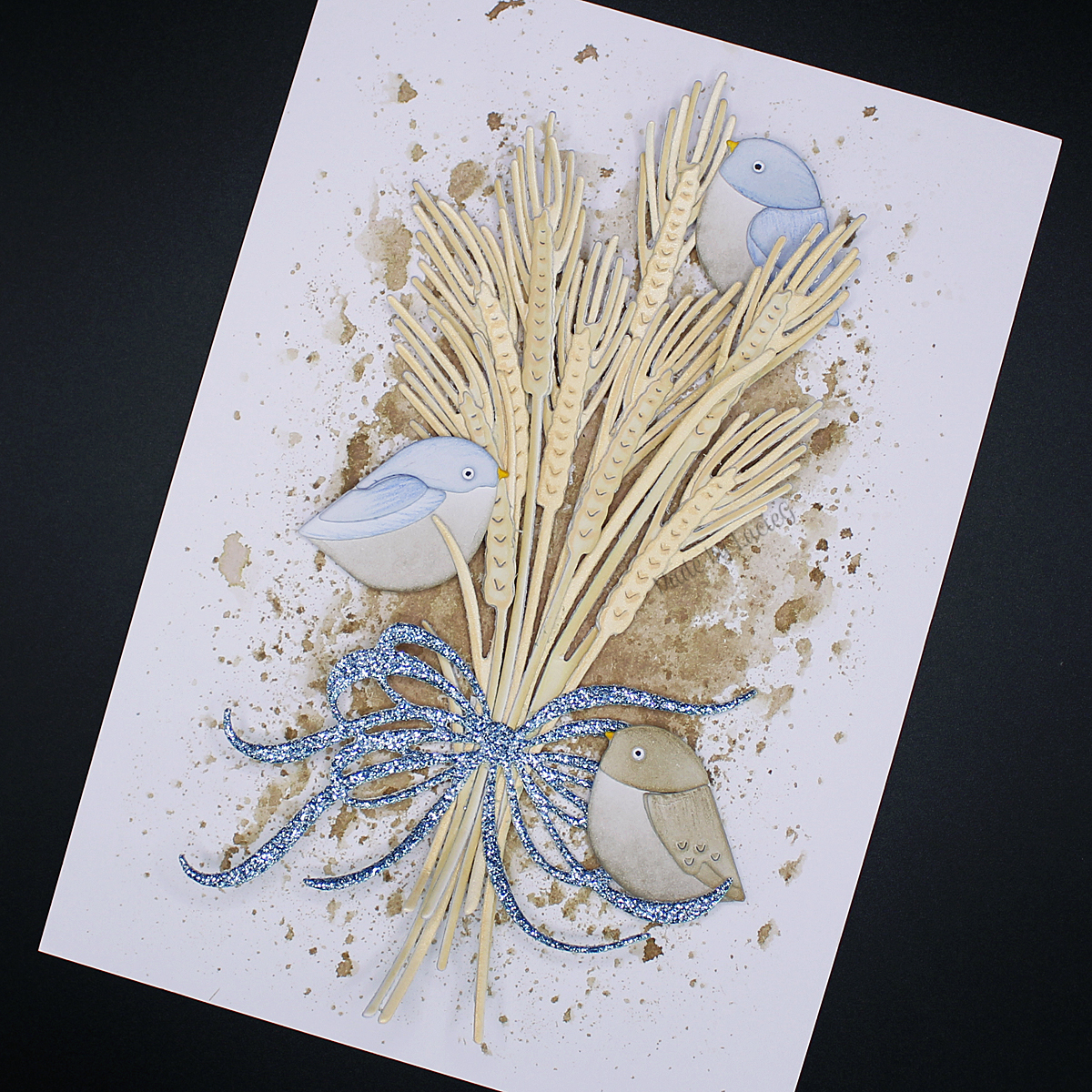 I arranged the wheat into a bundle and added a blue glittery bow from the Fit to be Tied die set. I then smooshed some Frayed Burlap distress ink onto a white card base and adhered the bundle on top.