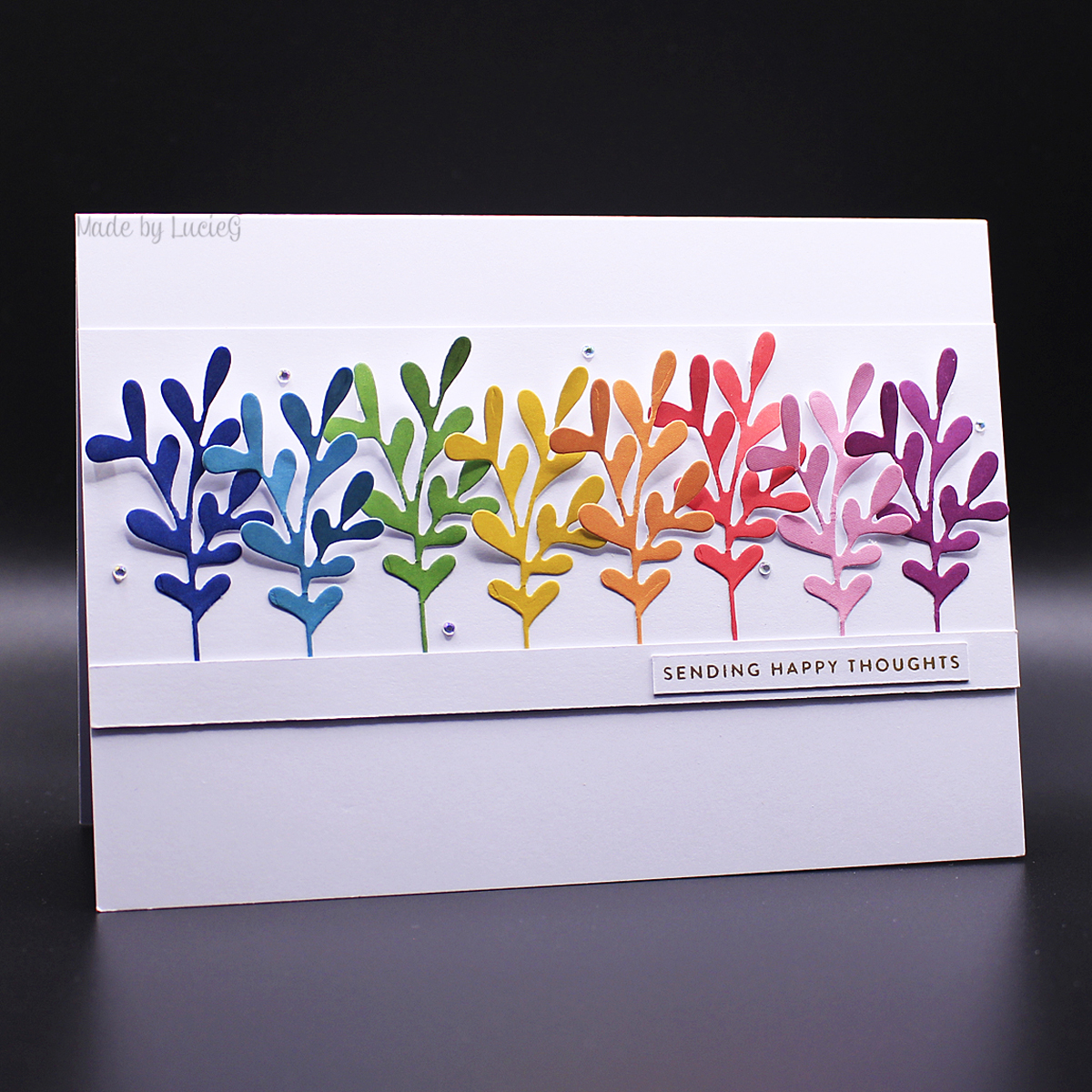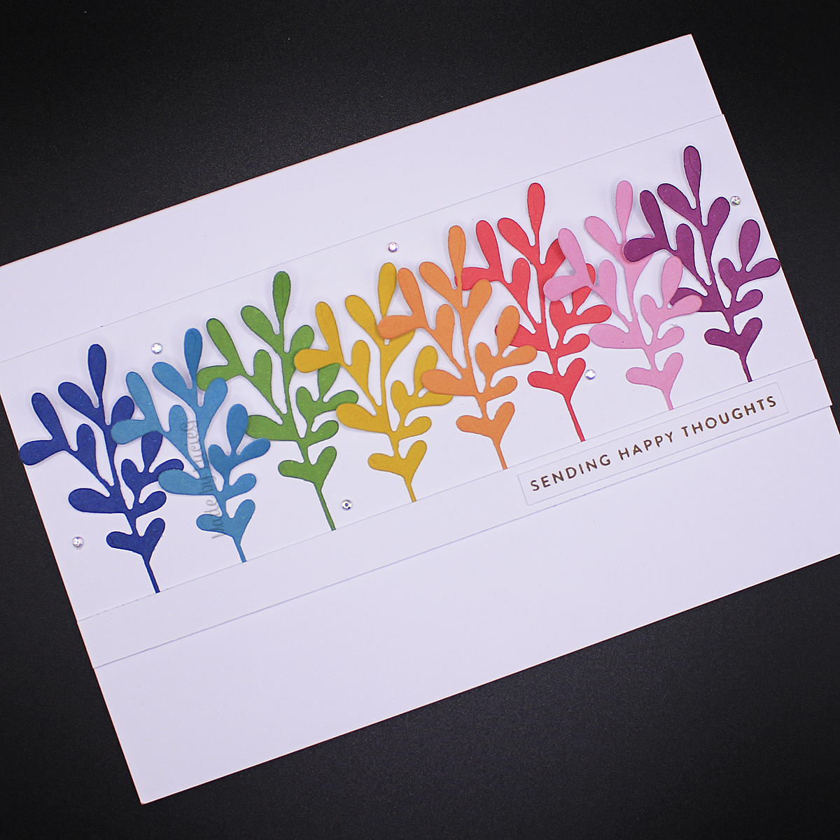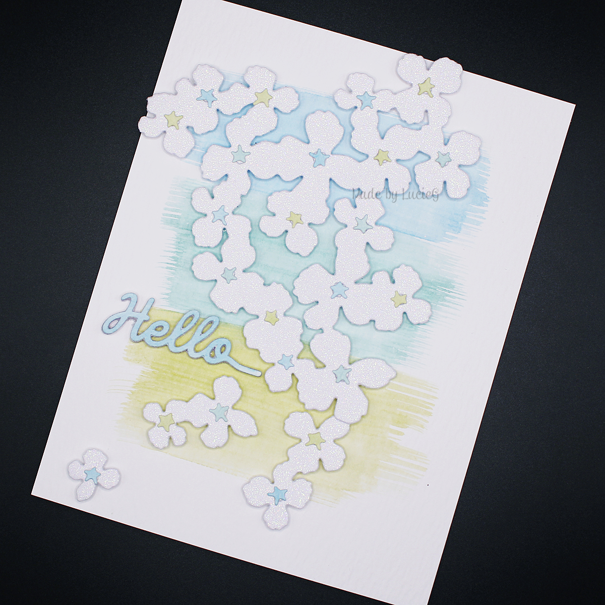 After trying MANY ideas with coloured card and patterned paper, I ended up with this super simple take by painting strips of colour and adding The Stamp Market’s Ready to Bloom die. The centres are from a small Spellbinders die set that I bought solely because I liked the little flower centres!