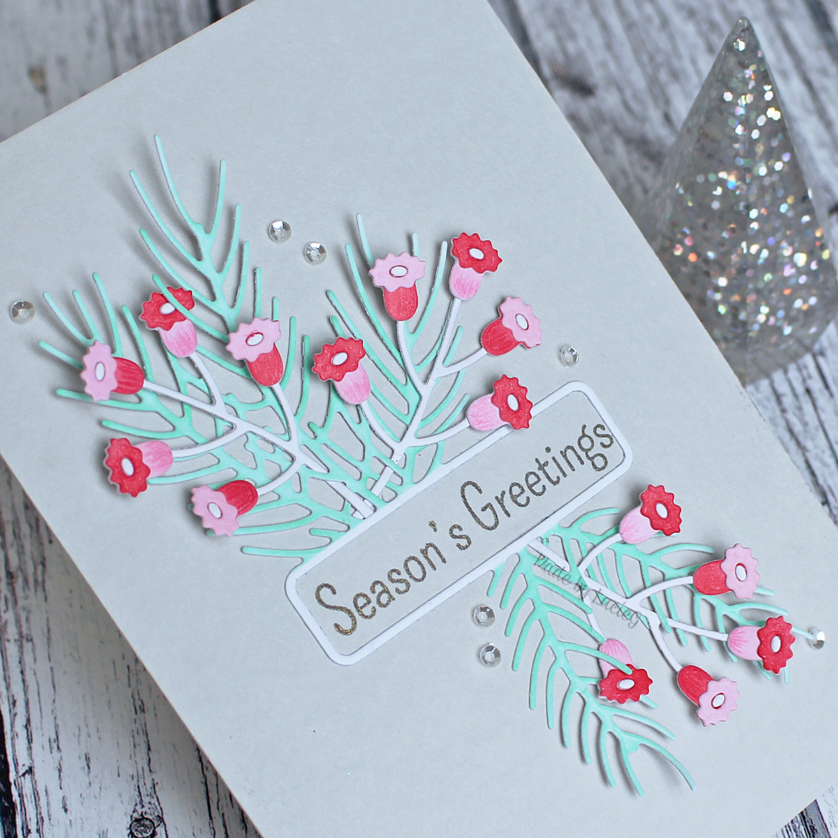 This card came together very quickly – I simply blended some distress ink on my card base, adhered the die cut and then added a Tonic die cut sentiment cut from holographic paper (so difficult to photograph!) and a few little stars!