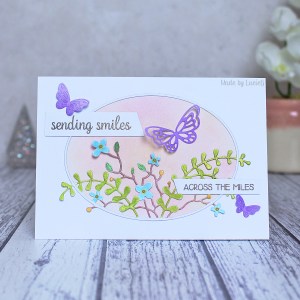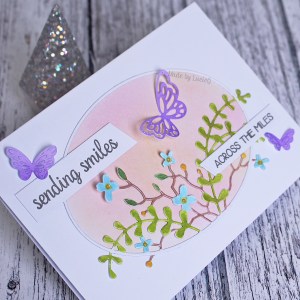 I added a few die cut butterflies from the Poppystamps Fern and Daisy Pop up Easel die set – I love how that set has so many different dies! The sentiment is a combination of two companies – Hero Arts and Whimsey Stamps.