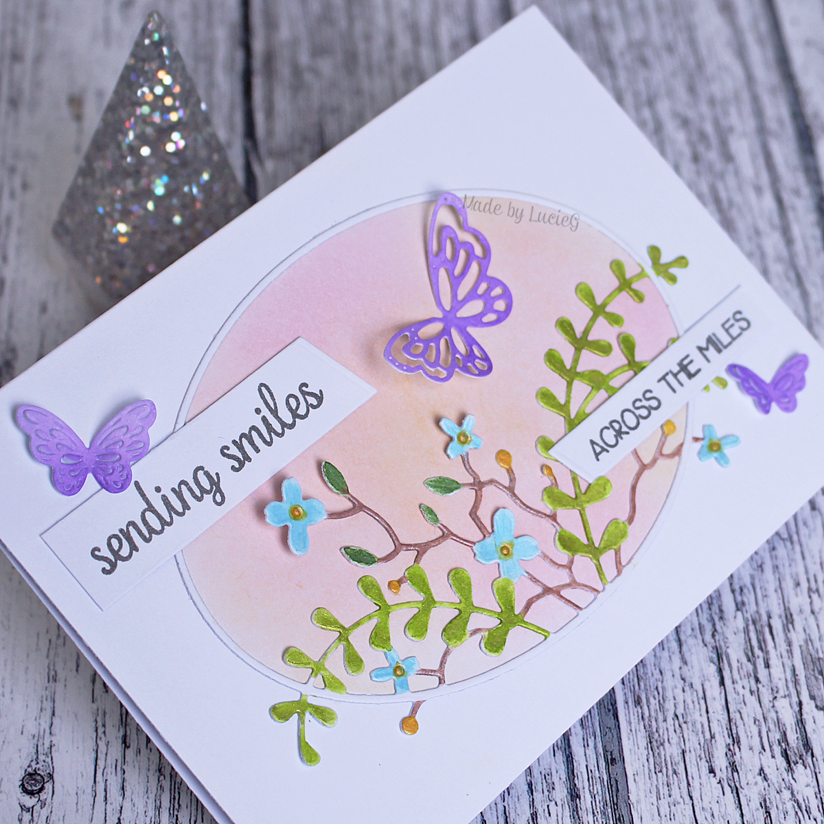 Today I’m playing along with the sketch challenge at Freshly Made Sketches. When I saw this week’s sketch, I started thinking of a couple of oval dies that I thought would work perfectly! In the end, I chose the Memory Box Fairhaven Oval die which I coloured with my beloved Twinkling H2Os.